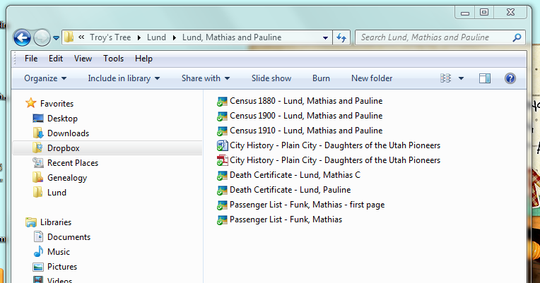 Here’s one of my source files for Troy’s g-g-grandparents Mathias and Pauline Lund. I have a few records for them including census’ and death certificates which are jpg files and a city history which I’ve saved in word and pdf versions.