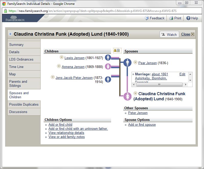 So, now I’m focusing on Didrich and Karen’s oldest child – Christine Funk Lund and her family. I started by using new.familysearch.org to see what was already out there.