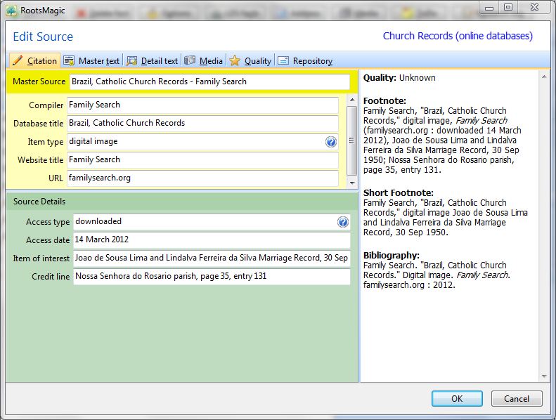 I make sure to copy the transcription/translation into my RootsMagic “Detail Text” tab for this source and to add the image of the original document under the “Media” tab. (Hint: do this for the first citation you make for this document – in my case, for the marriage of Joao and Lindalva. Once I have added all the relevant transcriptions and media I can choose “Memorize” and add this exact citation to any other fact. If I want to add any comments specific to the fact, I’ll go in and do that as well.)