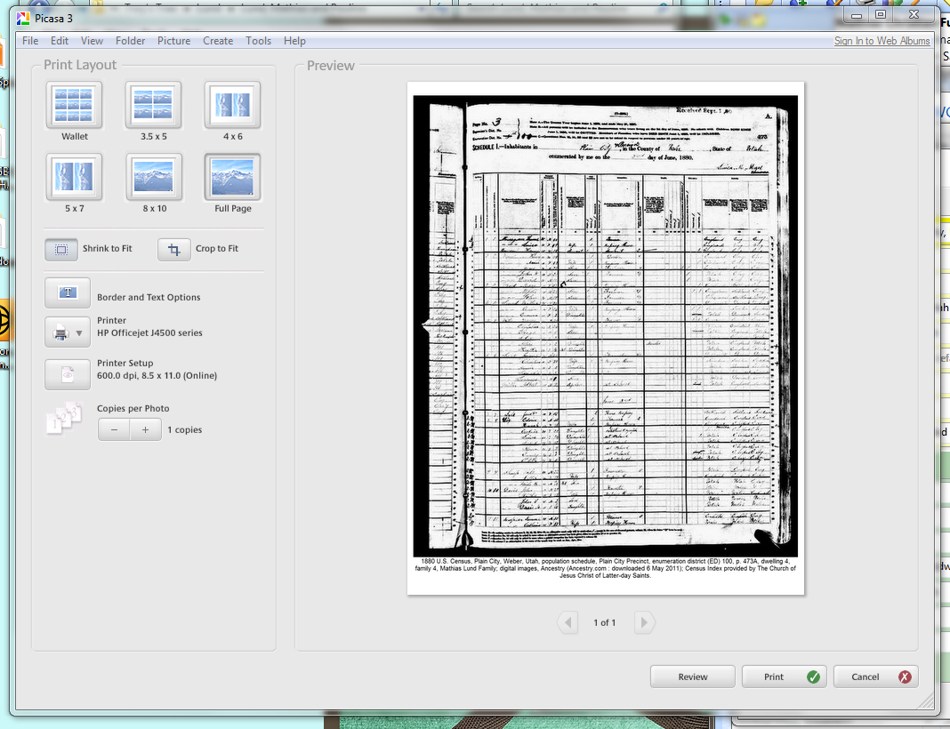 Now, another thing I can do with this file is save it as a pdf. This makes it really easy to share without having to print. I use cutePDF as the “printer”. If you install this program, then cutePDF shows up as a printer option. Then save your file with whatever name you want. Here’s the example of Mathias Lund’s 1880 Census for you to check out.