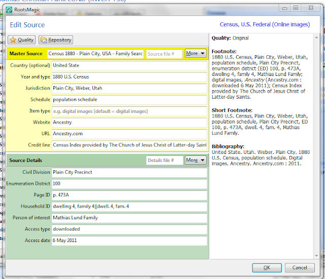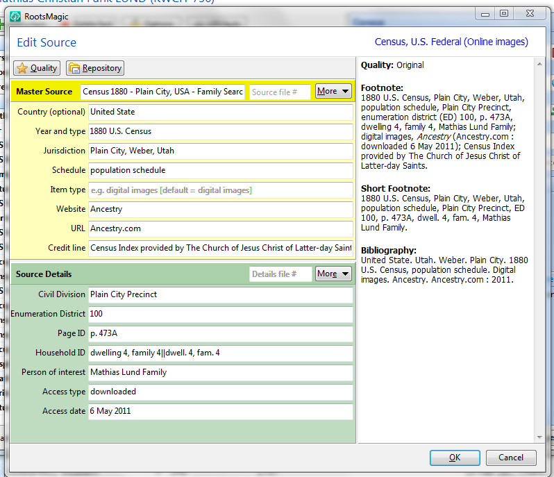 Open the source screen in Roots Magic 4. I used the “footnote” version of the source citation (on the right). I just highlighted it and copied it so I could paste it later.